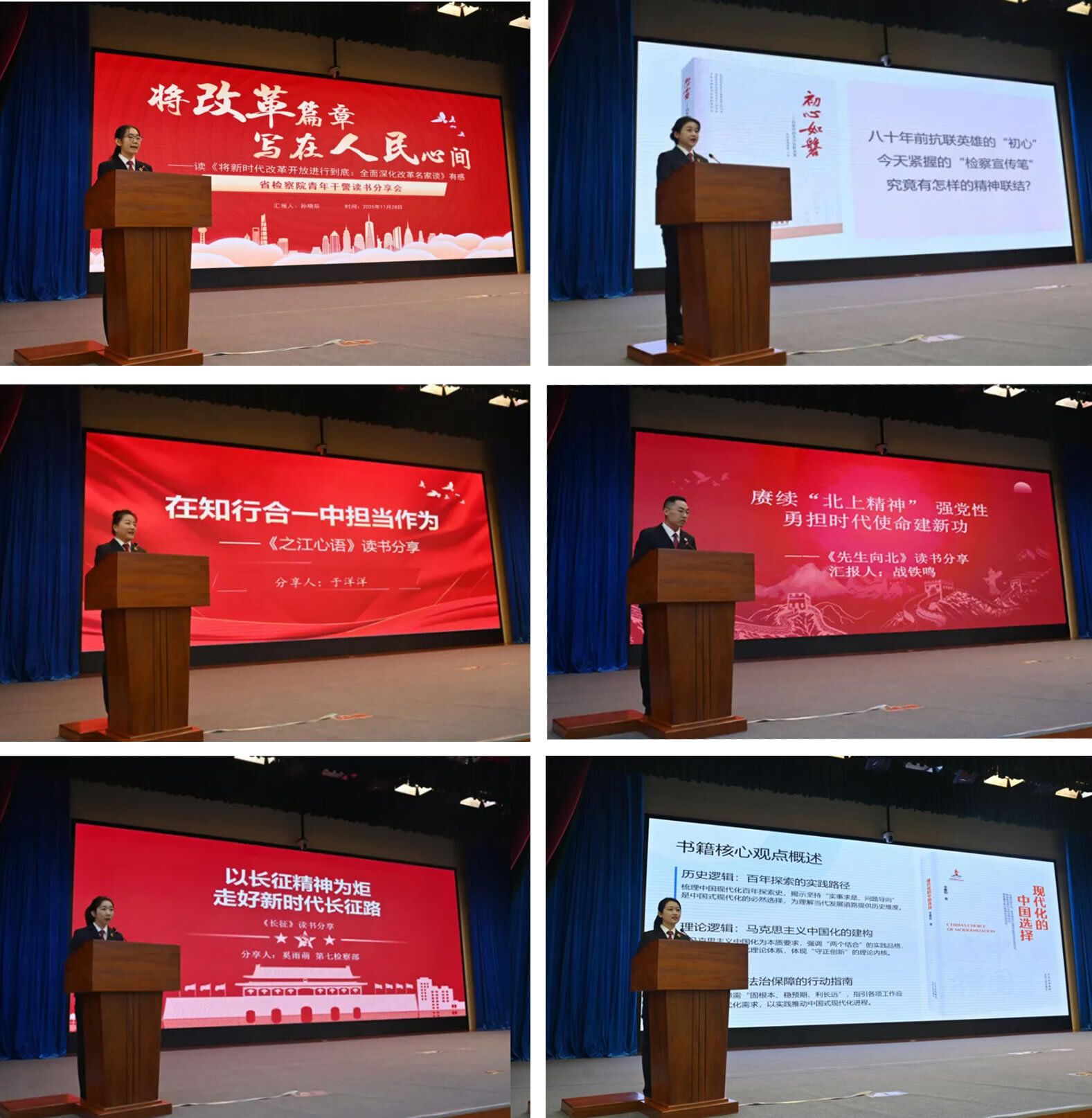 经济犯罪检察部战铁鸣带我们走进《先生向北》,回望先生们当年筚路蓝缕的创业历程,感悟新时代如何传承“北上精神”,直面发展难题、破解民生痛点,在攻坚克难中践行初心使命。政治部综合处孙晓辰结合《将新时代改革开放进行到底:全面深化改革名家谈》思考如何立足本职,在进一步全面深化改革中贡献检察力量。