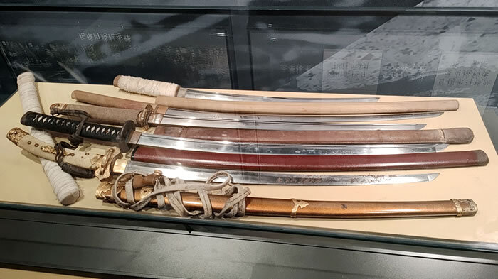 刀身泛着寒光,每一把刀都配有刀鞘。一把俄式军刀和5把日式刀在展出现场分开陈列。